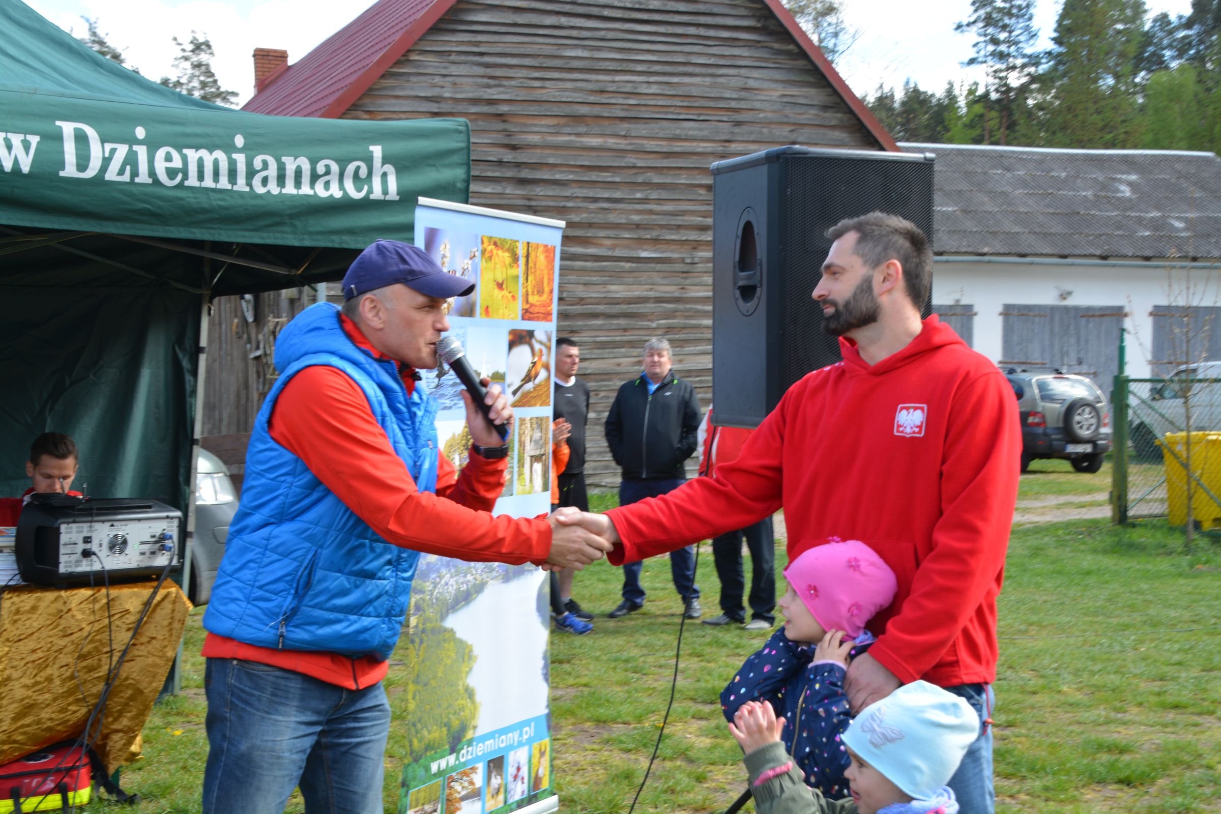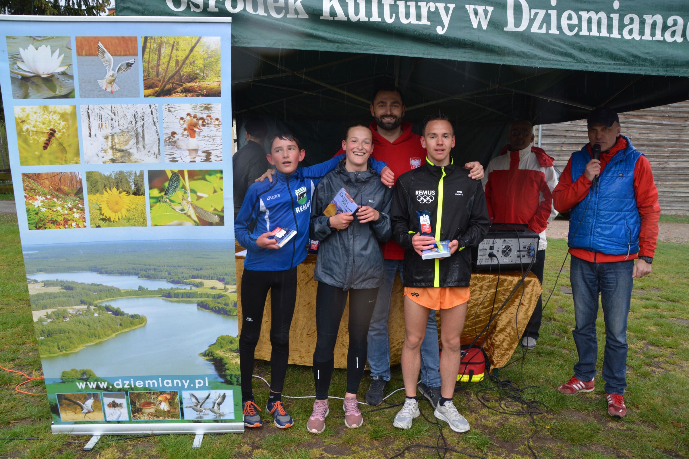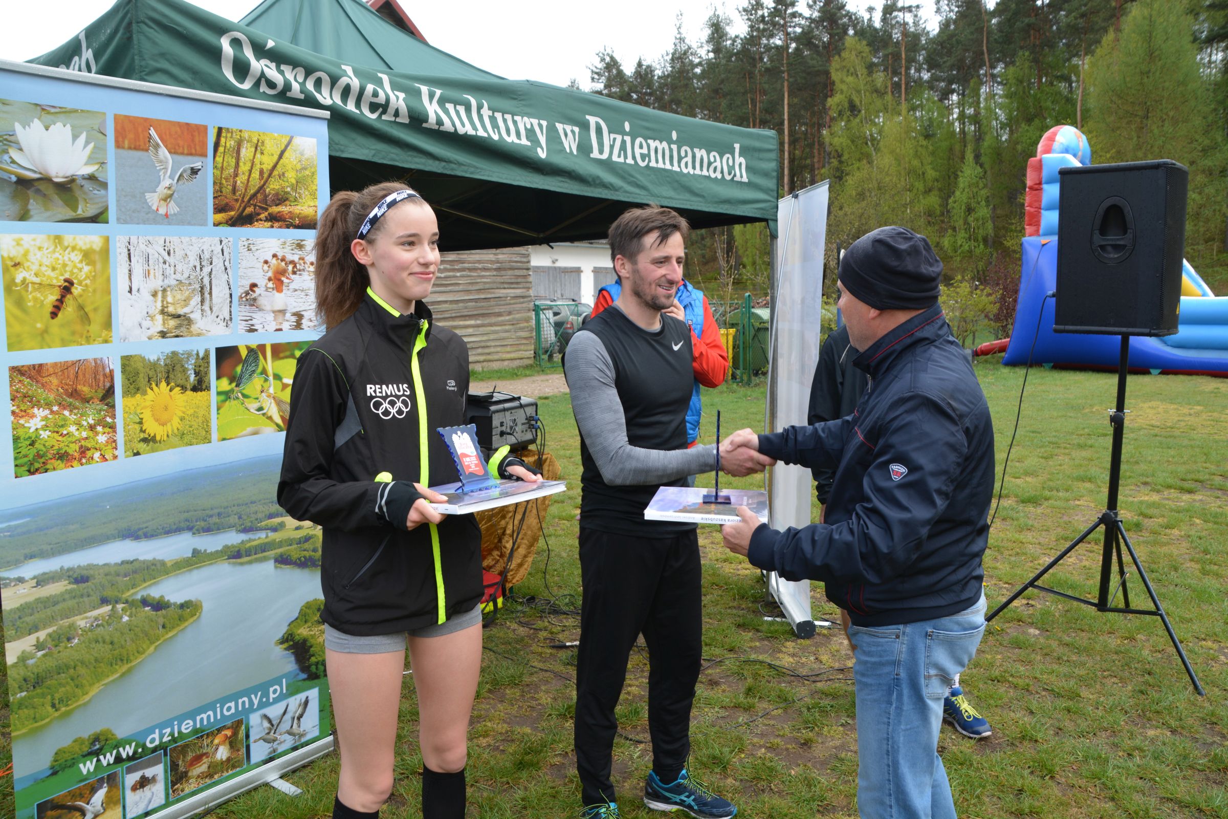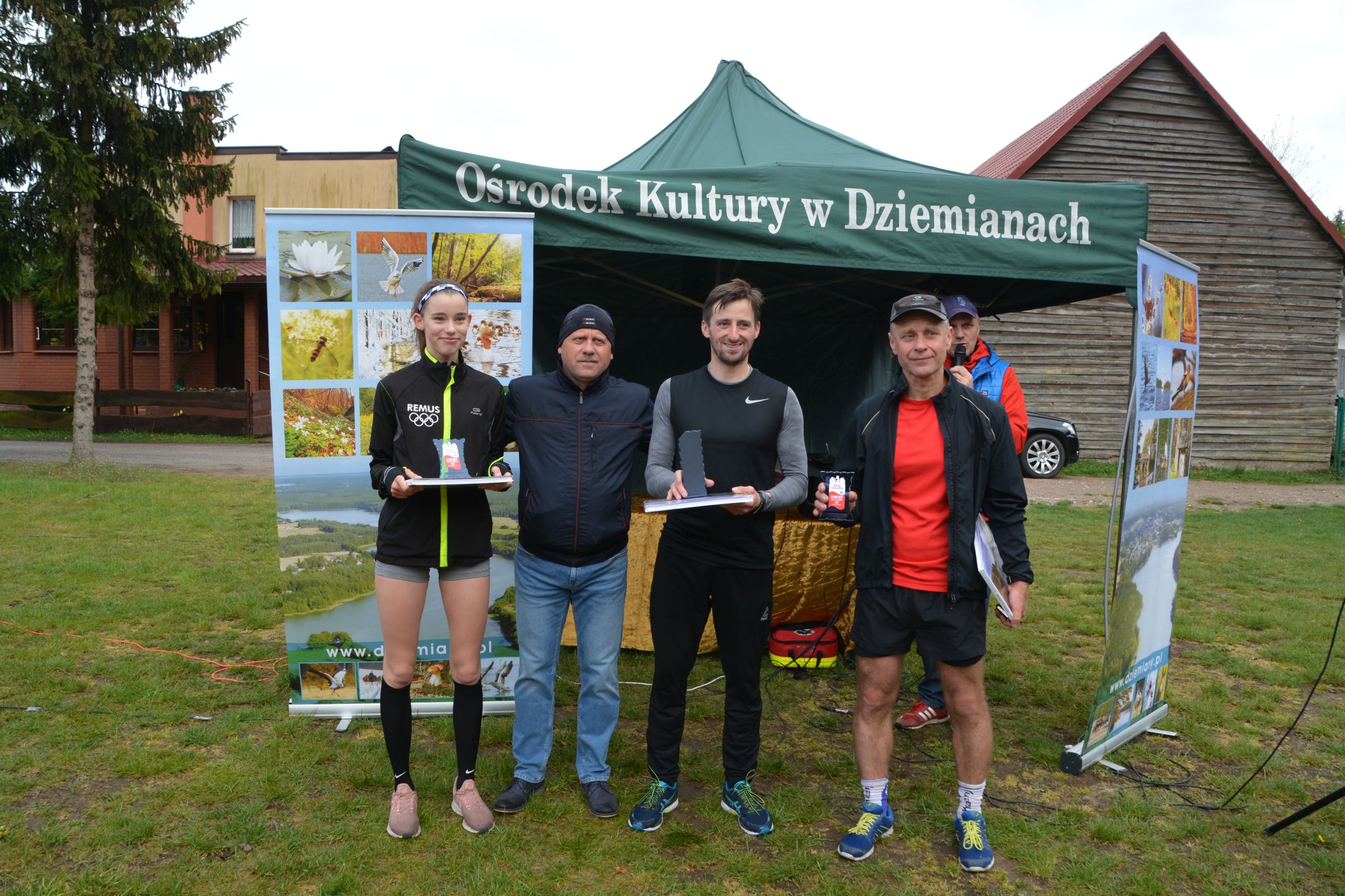 Około 100 osób stawiło się w piątek 3 maja w kompleksie domków letniskowych p. Violetty Cysewskiej, by uczestniczyć w Dziemiańskiej Dyszce. Biegi rozgrywane były w kategoriach: przedszkole, klasy I-III, IV-VI, VII-VIII i gimnazjum oraz główna kategoria 10 km Open. Biegom patronował wywodzący się z Dziemian, olimpijczyk, Łukasz Chyła. W słowach kierowanych do zebranych podziękował, obecnemu na zawodach, pierwszemu trenerowi Wojciechowi Pobłockiemu oraz wszystkim uczestnikom, którzy stawili się na starcie zorganizowanych zawodów. Jednocześnie zachęcał do codziennych treningów, by w przyszłym roku na kolejnej edycji było nas jeszcze więcej. Uczestnicy rozgrzewani do rywalizacji przez reprezentanta Polski, stoczyli równy bój o Laur zwycięstwa. Najszybsi okazali się: