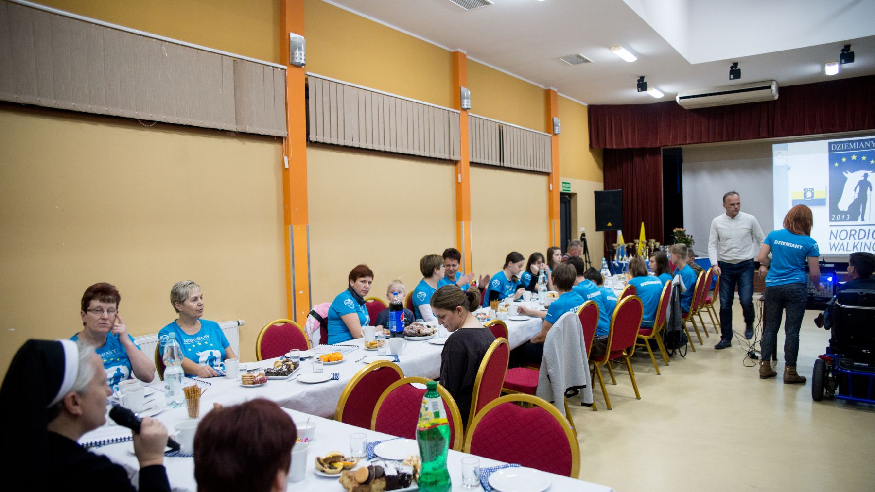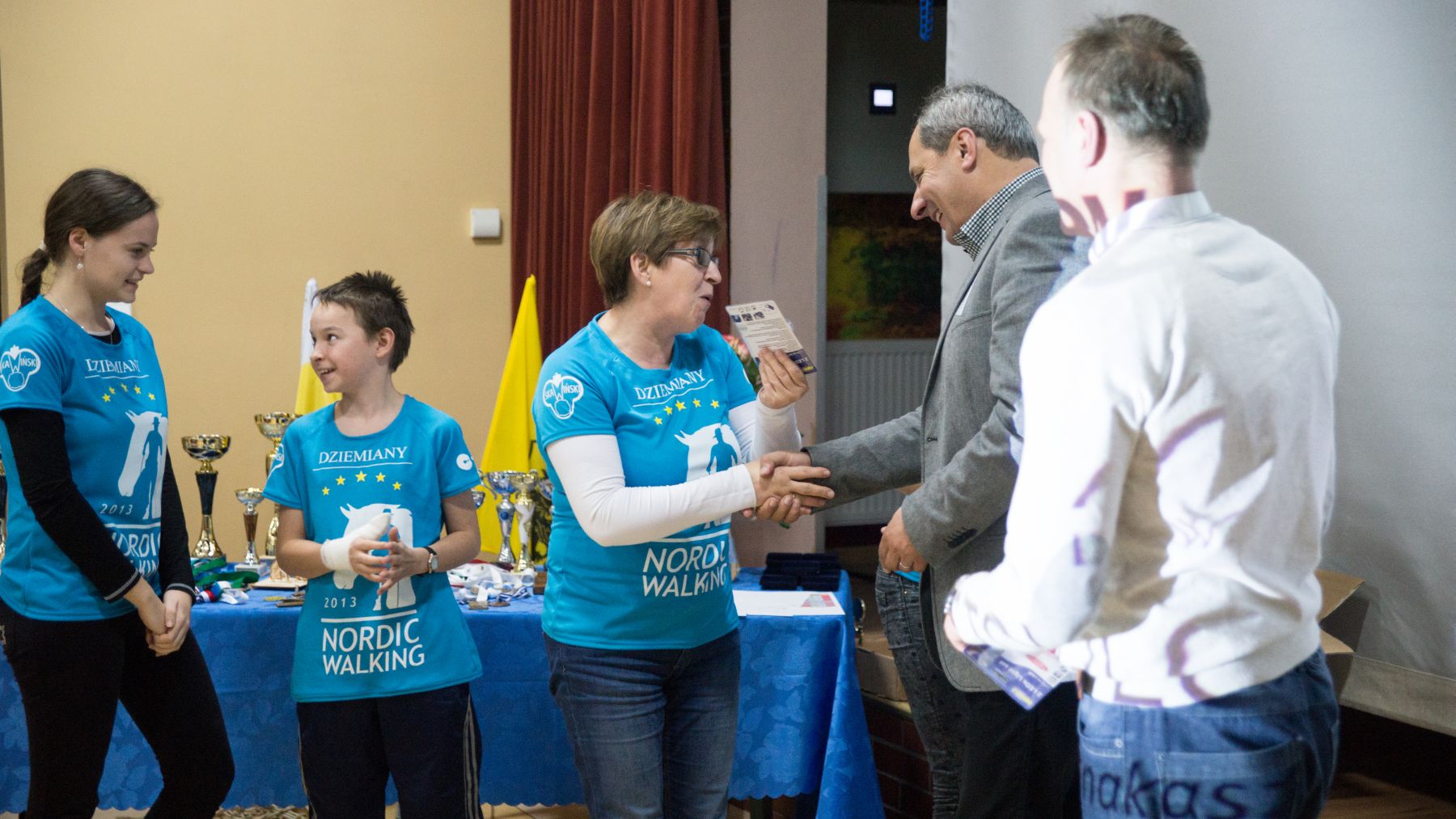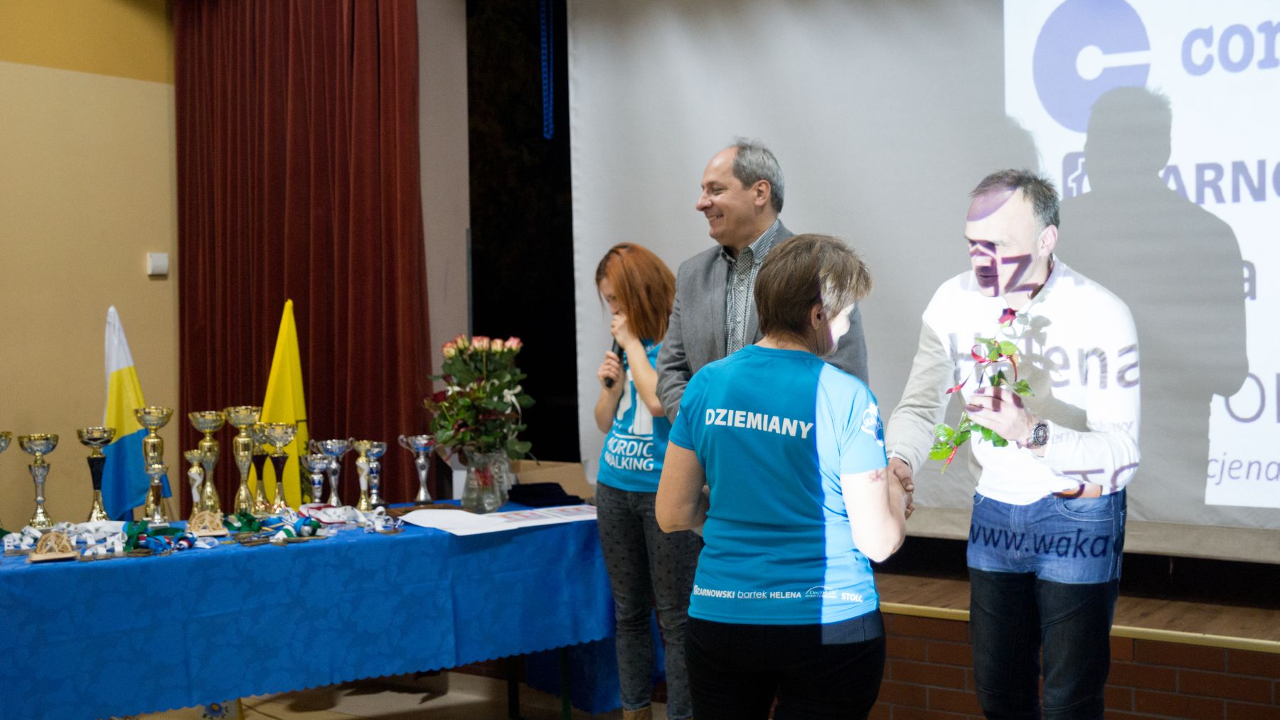Spotkanie prowadziła Instruktorka drużyny Joanna Stopa. Przybliżyła zagadnienie Nordic Walking jak i przedstawiła poprawną technikę chodzenia o kijkach. Zaprezentowane zostały również statystyki udziału w zajęciach Nordic Walking w roku 2014. Następnie nadszedł czas prezentacji wizualnej, która zobrazowała wspomnienia drużyny z rywalizacji na trasie etapów Pucharu Polski jak i Pucharu Bałtyku. Podczas finalnej części spotkania Instruktorka wyróżniła najlepszych zawodników drużyny Nordic Walking w roku 2014. Statuetki oraz kwiaty wręczali zasłużonym Wójt Gminy Dziemiany oraz Dyrektor Ośrodka Kultury Dariusz Turzyński. Podziękowania złożone zostały również na ręce sponsorów, którzy wsparli drużynę pod koniec tegorocznych zmagań w zawodach. To dzięki nim drużyna ujednoliciła swój wizerunek błękitnymi koszulkami oraz flagą z własnym logotypem.