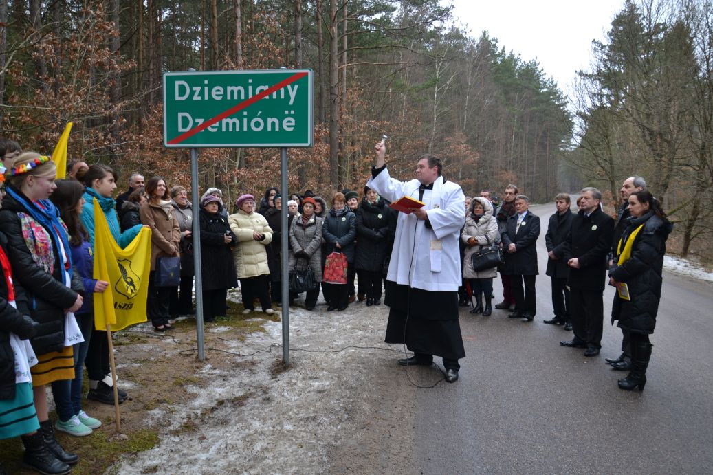W piątek 14 lutego 2014 o godzinie. 11.00 przy tablicy wjazdowej do Dziemian od strony Bytowa odbyła się uroczystość jej symbolicznego odsłonięcia w obecności mieszkańców Gminy oraz licznie zebranych uczniów ze szkół w Dziemianach. Obecni byli również członkowie tutejszego oddziału Zrzeszenia Kaszubsko-Pomorskiego, którzy wraz z sołtysami oraz wolontariuszami aktywnie przyczynili się do realizacji tego projektu.