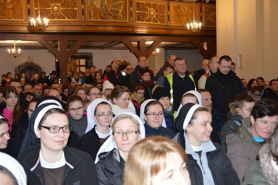 O godz. 20.00. rozpoczęła się msza św. w kościele św. Antoniego w Dziemianach koncelebrowana pod przewodnictwem ks. Prałata Mariana Szczepińskiego. Świątynia wypełniona była po brzegi. Niespotykana atmosfera radości i duch wspólnego celu połączyła uczestników na modlitwie. Radość z tak ogromnego wydarzenia usłyszeliśmy od gospodarza parafii Ks. proboszcza Adama Gadomskiego i Wójta Gminy Dziemiany p. Leszka Pobłockiego. Z ambony popłynęły także słowa z listu Ks. Biskupa Ryszarda Kasyny. Istotę duchowości EDK w homilii przybliżył ks. Andrzej Adamski z Tucholi. Na koniec mszy św. s. Mirona Turzyńska (franciszkanka z Orlika) w imieniu ekipy EDK Dziemiany przypomniała regulamin, sprawy porządkowe i bezpieczeństwa, dziękując jednocześnie za ofiarną pracę wolontariuszy. Ekipę EDK tworzyły wraz z s. Mironą – s. Daniela, s. Anna oraz Joanna Stopa.