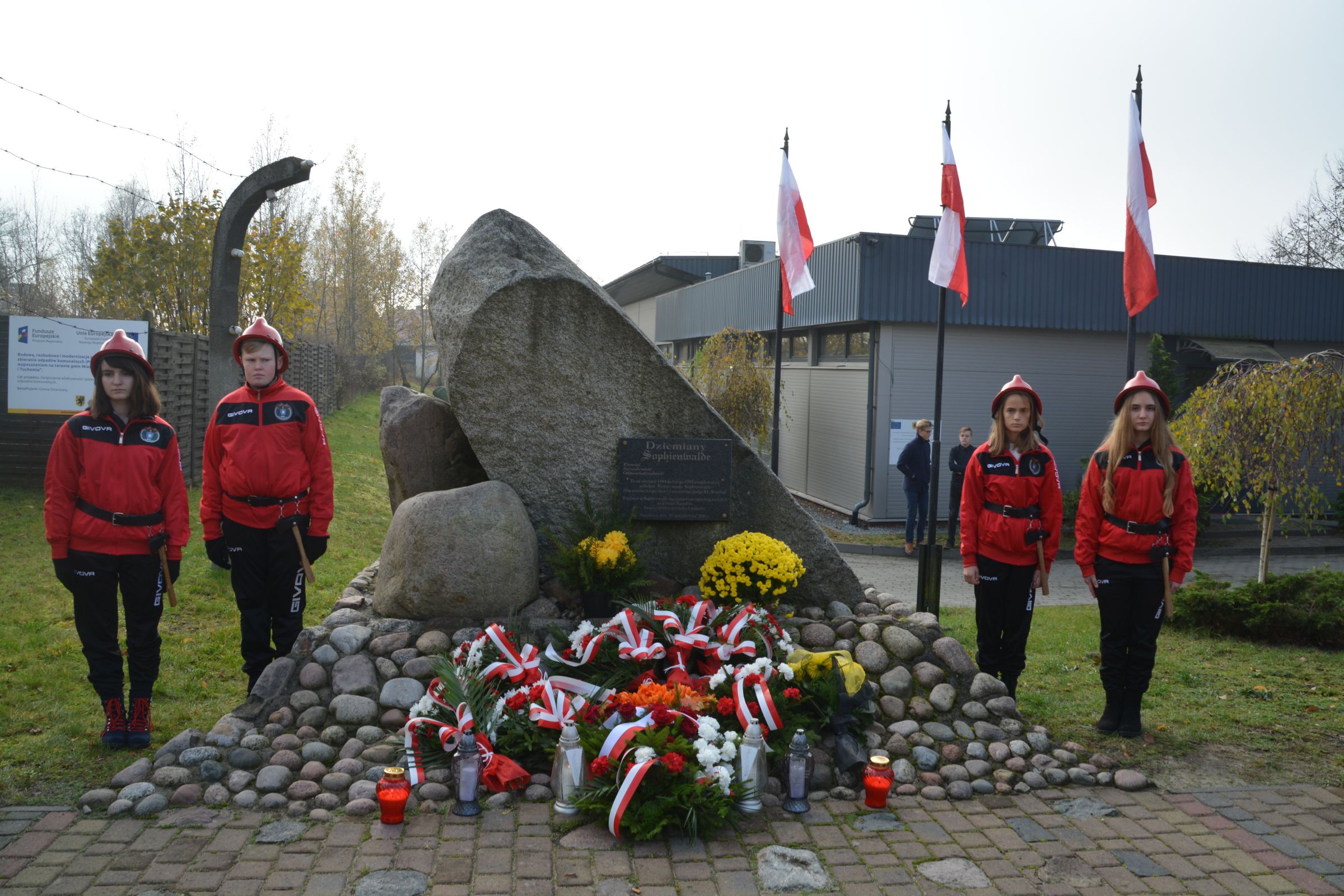 Potem nastąpiło uroczyste złożenie wiązanek kwiatów pod Pomnikiem Ofiar Podobozu Sophienwalde, który był filią obozu Stutthof. Delegacje reprezentowały władze gminy, lokalne instytucje i organizacje oraz szkoły, wraz z którymi uczniowie SP w Dziemianach oddali hołd przed symbolicznymi “Dębami Pamięci Ofiar Katyńskich”.