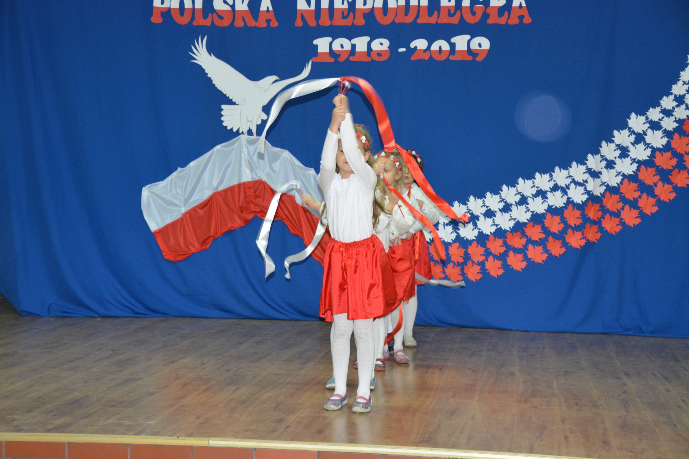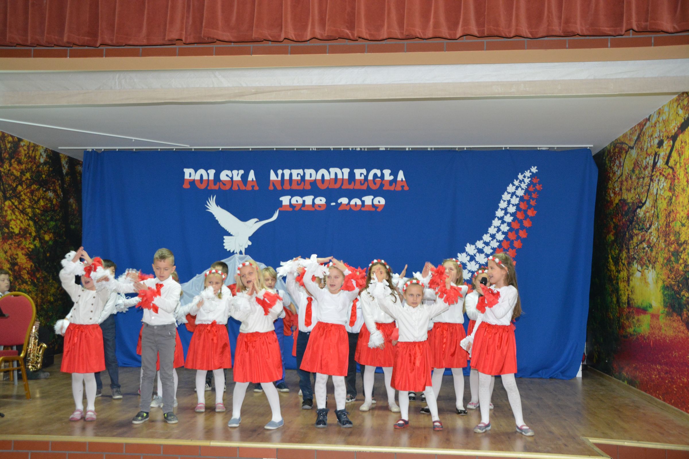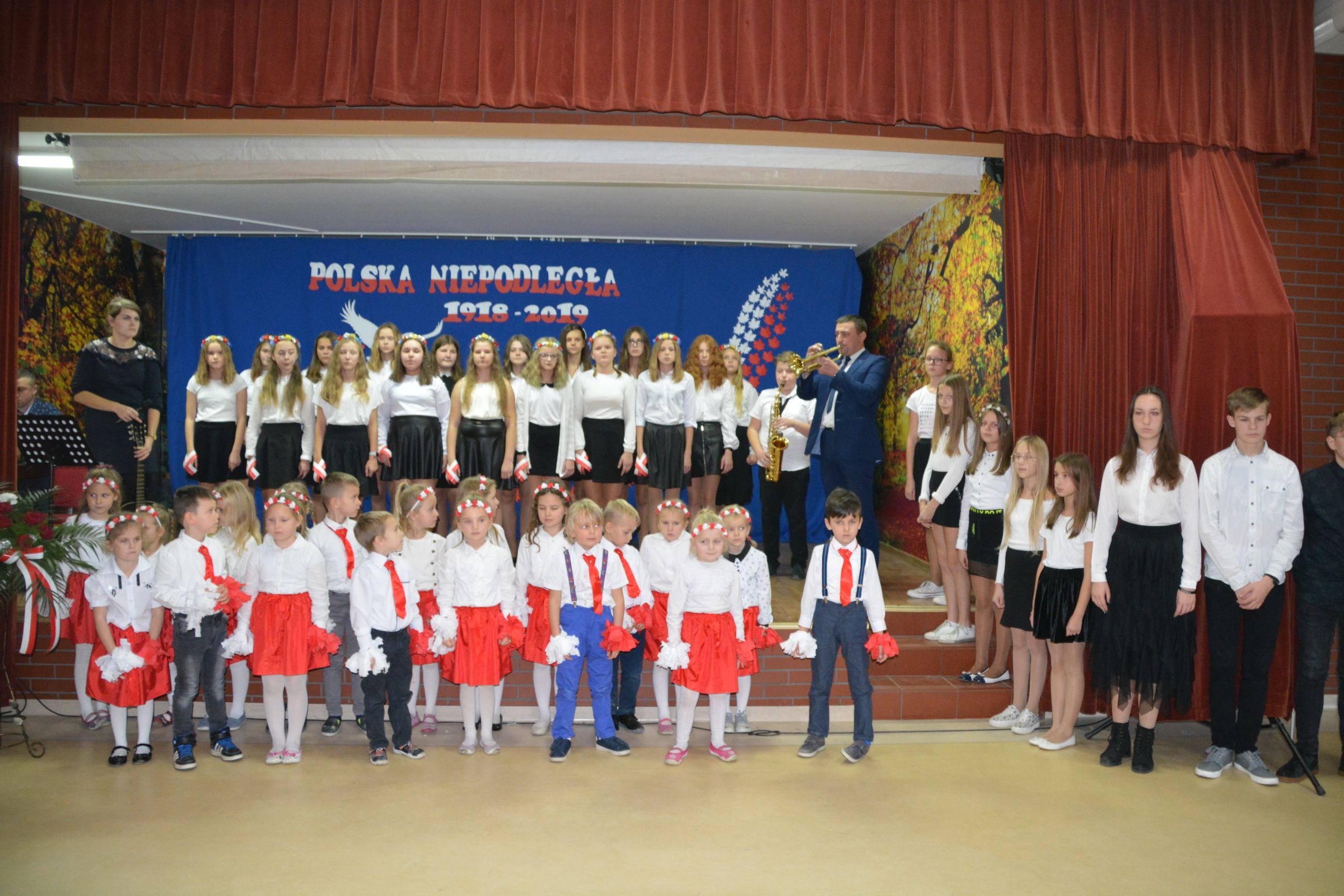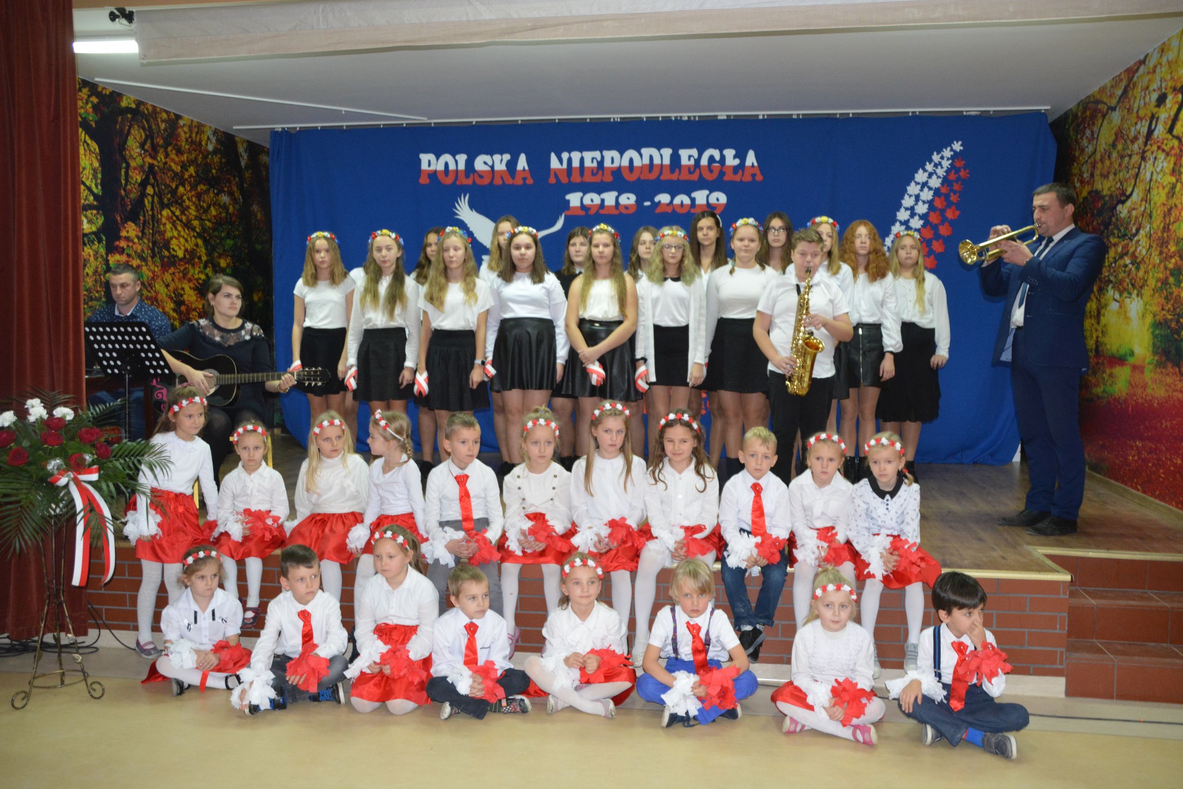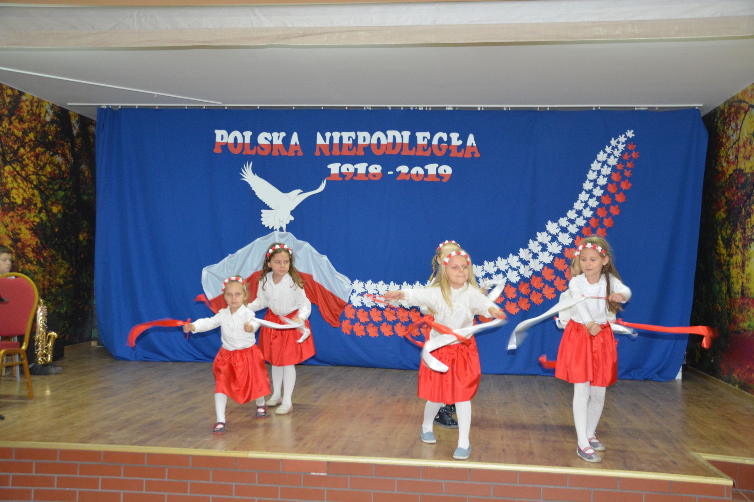 Finałową częścią uroczystości był udział w występie artystycznym przygotowanym przez uczniów SP w Dziemianach. Uwagę przyciągała dekoracja, na której środku wznosił się biały orzeł. Całość wyrażała szacunek do naszych symboli narodowych. Poczucie patriotyzmu i chęć jego wzmocnienia wyrazili uczniowie w takich utworach jak: “Taki kraj”, “Pola”, Polskie kwiaty”, “Jak długo w sercach naszych”. Radosnym uzupełnieniem był występ klasy zerowej, która strojami w barwach flagi Polski, piosenką i tańcem podkreśliła wartość tego święta. Jako Kaszubi, znani z pielgrzymek do Kalwarii Wielewskiej, co jest w naszej tradycji, lubimy muzykę płynącą z instrumentów dętych, dlatego trąbka i saksofon brzmiące melodią “Jak długo w sercach naszych” wniosły ekscytujące przeżycie.