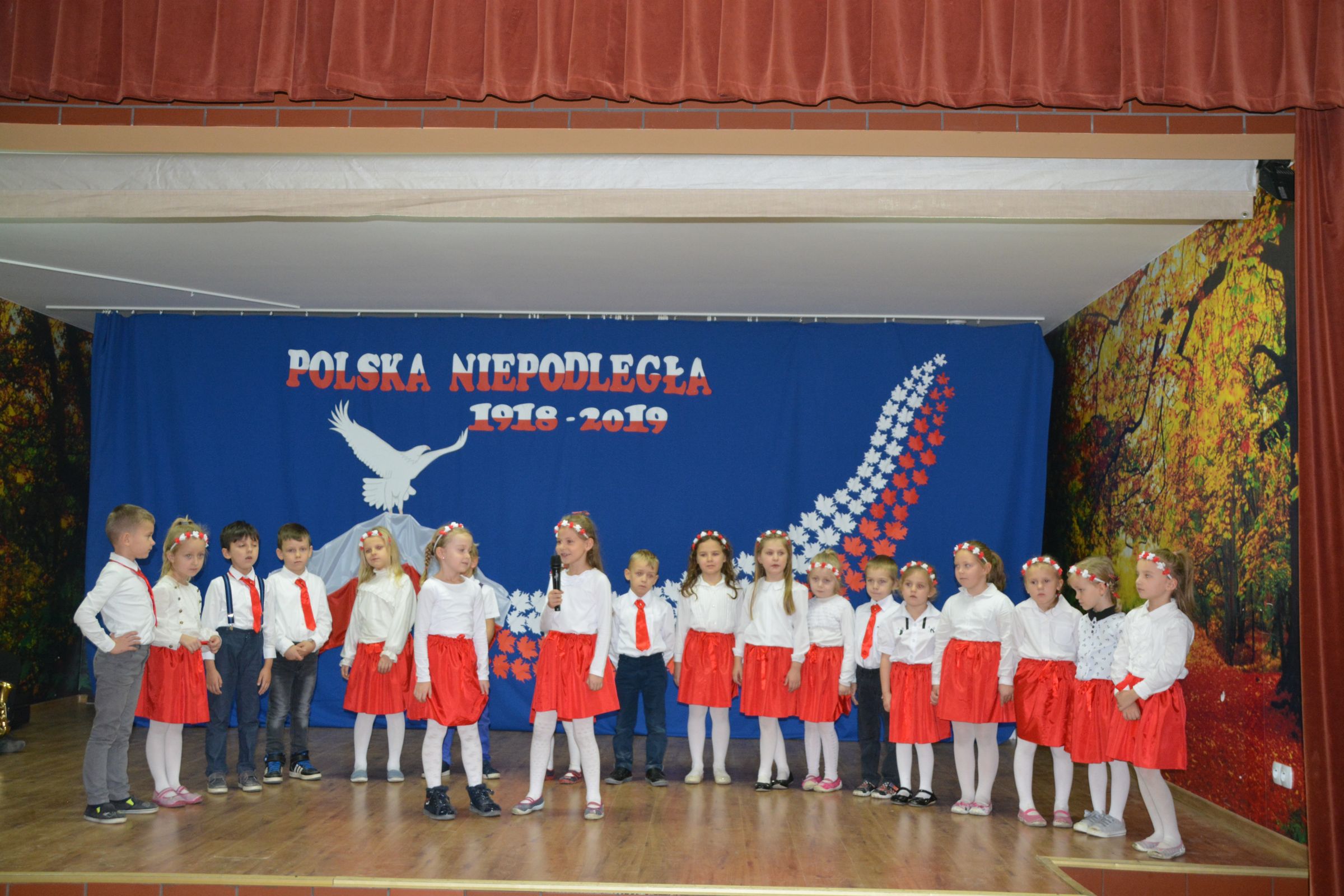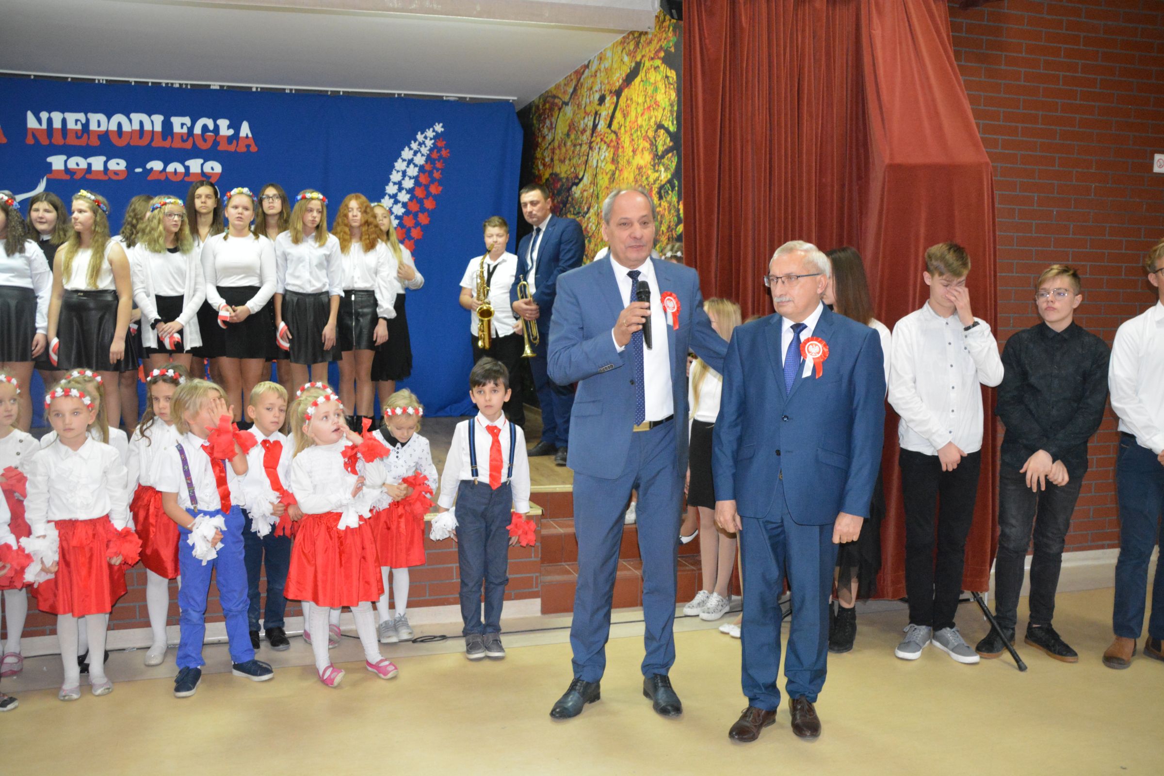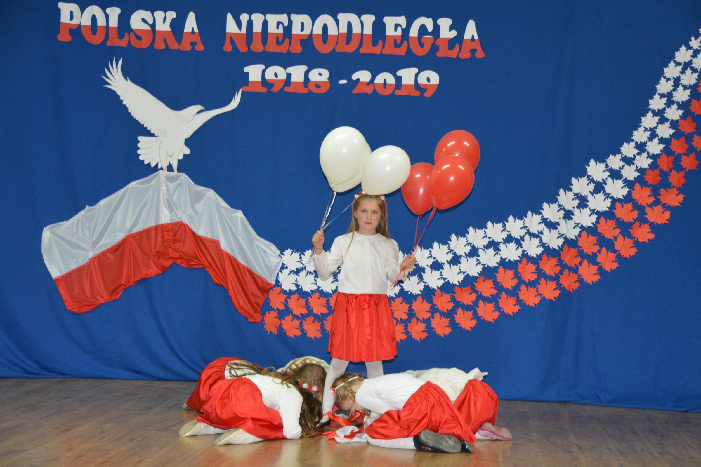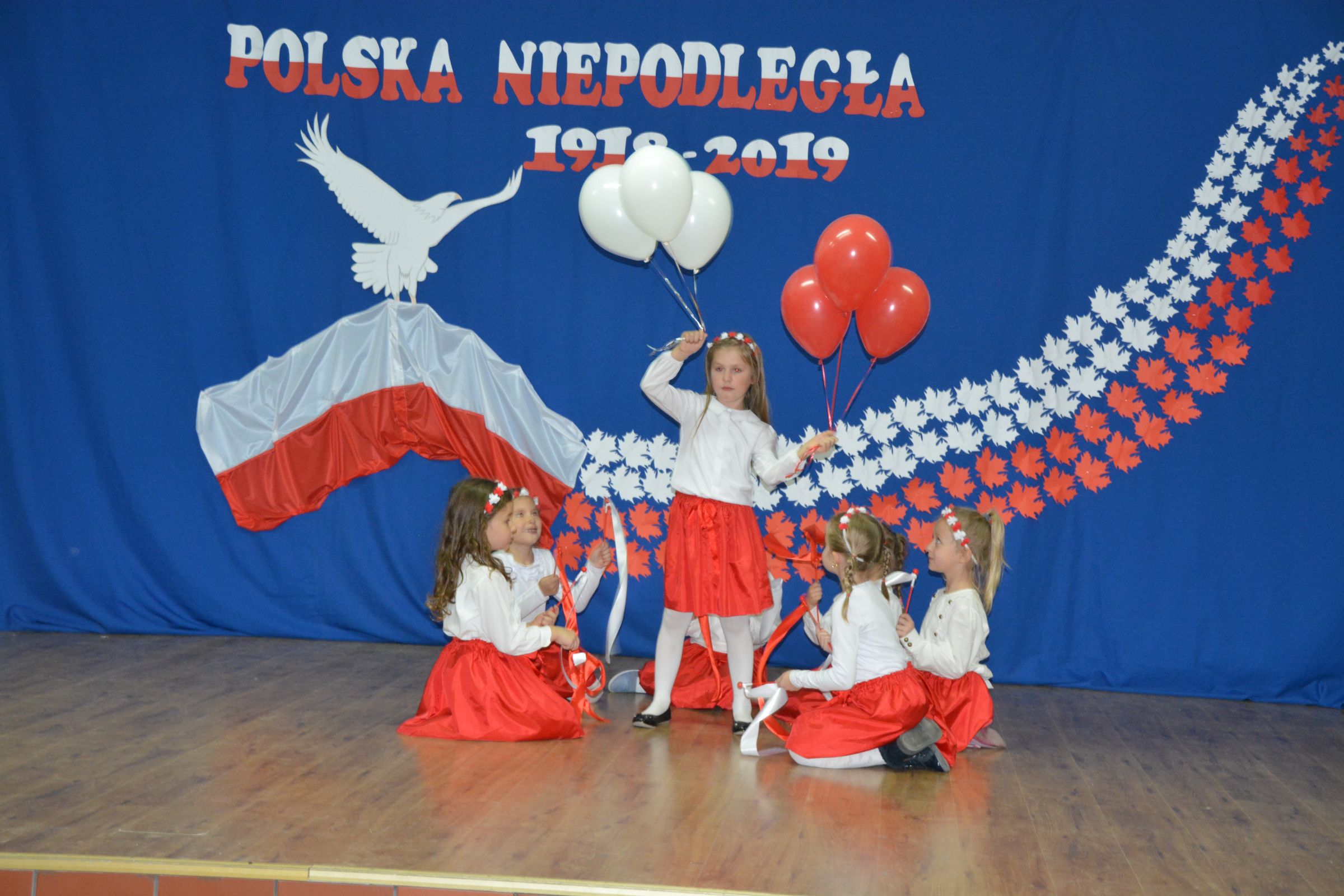 Finałową częścią uroczystości był udział w występie artystycznym przygotowanym przez uczniów SP w Dziemianach. Uwagę przyciągała dekoracja, na której środku wznosił się biały orzeł. Całość wyrażała szacunek do naszych symboli narodowych. Poczucie patriotyzmu i chęć jego wzmocnienia wyrazili uczniowie w takich utworach jak: “Taki kraj”, “Pola”, Polskie kwiaty”, “Jak długo w sercach naszych”. Radosnym uzupełnieniem był występ klasy zerowej, która strojami w barwach flagi Polski, piosenką i tańcem podkreśliła wartość tego święta. Jako Kaszubi, znani z pielgrzymek do Kalwarii Wielewskiej, co jest w naszej tradycji, lubimy muzykę płynącą z instrumentów dętych, dlatego trąbka i saksofon brzmiące melodią “Jak długo w sercach naszych” wniosły ekscytujące przeżycie.