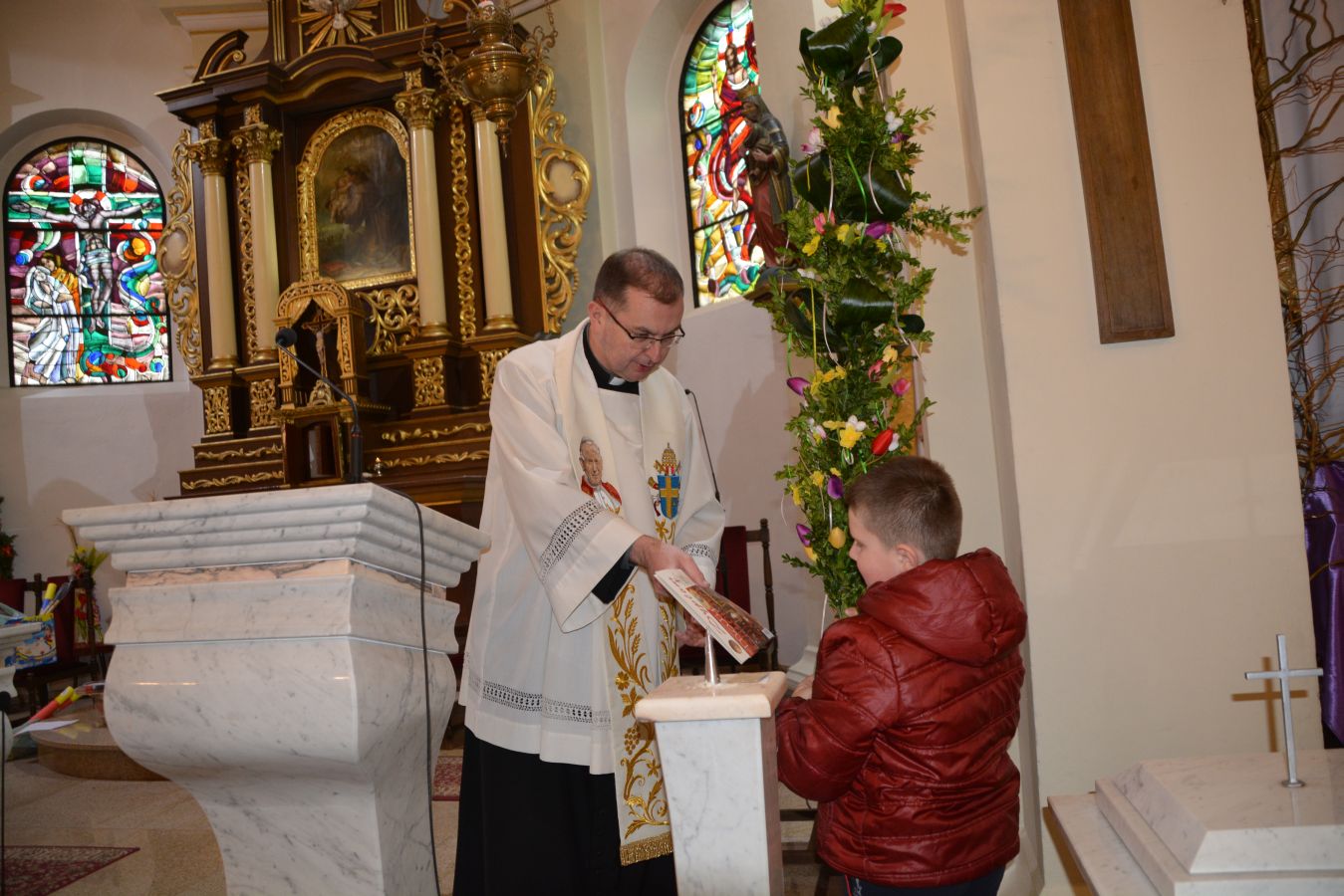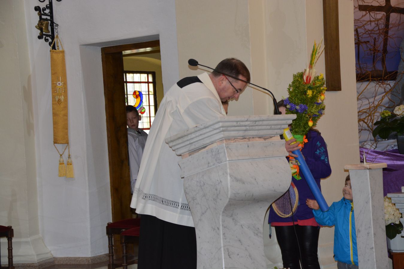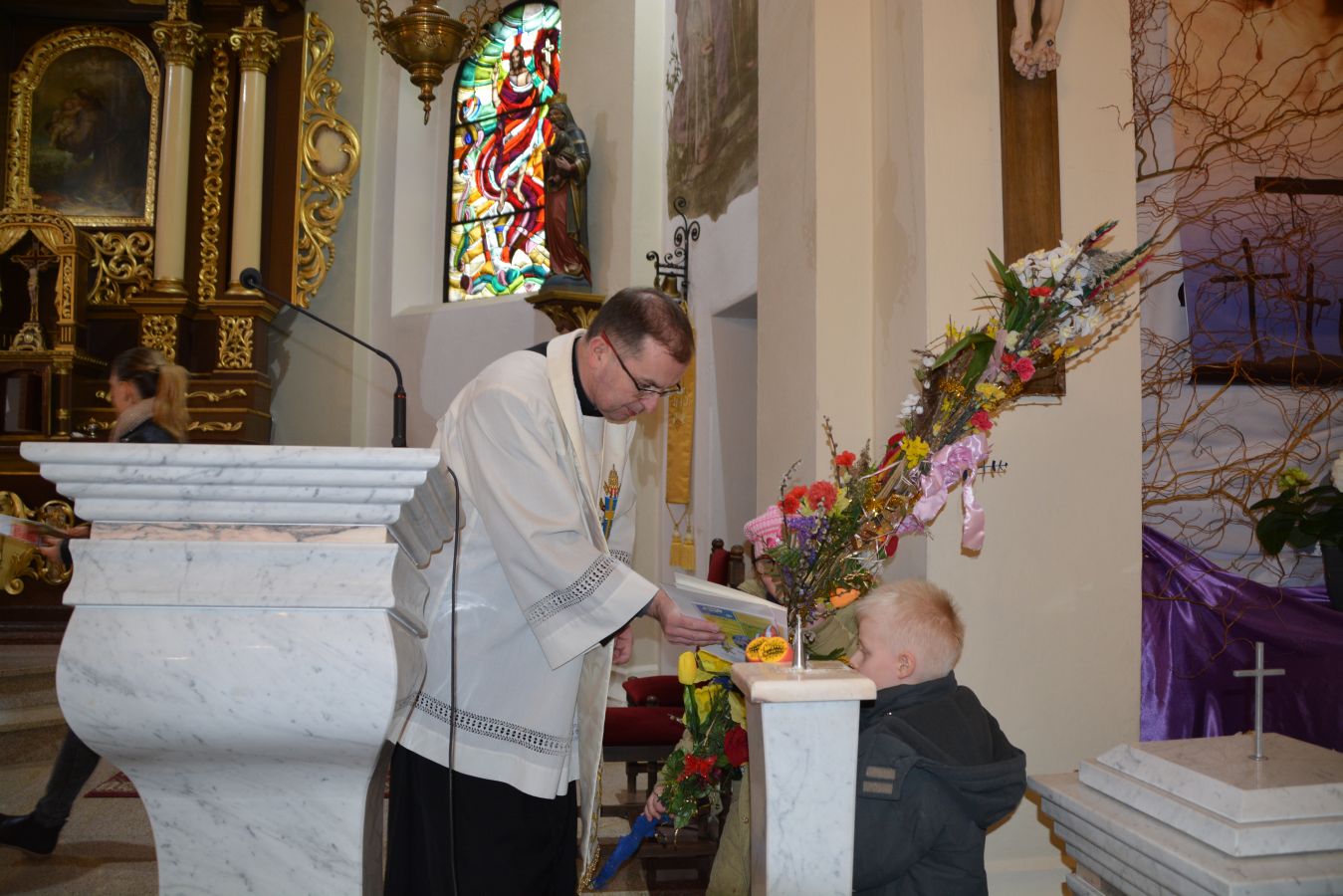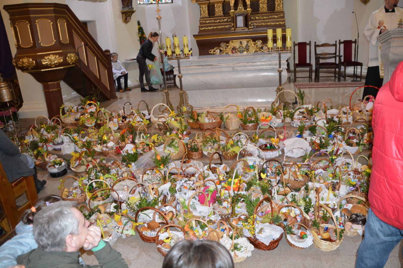 W Wielką Sobotę w Kościele Katolickim odbywa się tradycyjne święcenie pokarmów. Tak było również i w naszej parafii. Podczas „Święconki” o godz. 12.00 tradycyjnie swój wielkanocny koszyk składa wybrane sołectwo. W tym roku koszyk wielkanocny przygotowało Sołectwo Raduń. Jest to zwyczaj zapoczątkowany w ubiegłym roku. Podczas święcenia pokarmów został rozstrzygnięty konkurs na Palmę Wielkanocną w trzech kategoriach: palm wysokich, średnich i małych. Po błogosławieństwie ksiądz zaprosił wszystkich na oficjalną odsłonę Największego Jaja na Kaszubach. Mieszkańcy z podziwem oglądali ponad 3,5 metrowe Kaszubskie Jajo upamiętniając tą chwilę rodzinnym zdjęciem.