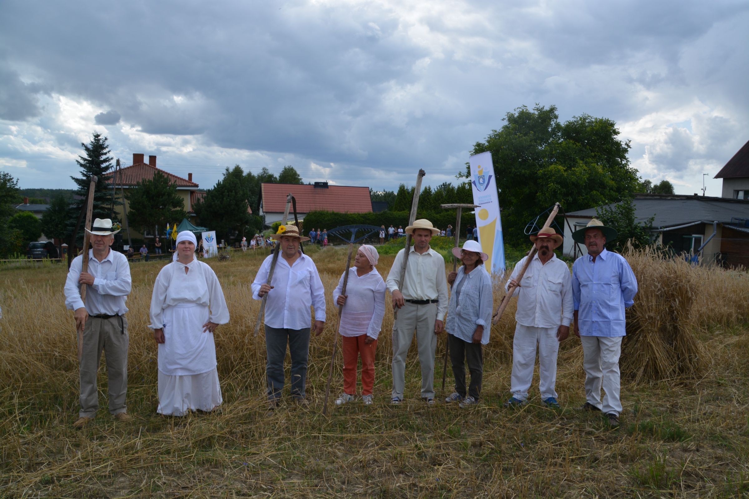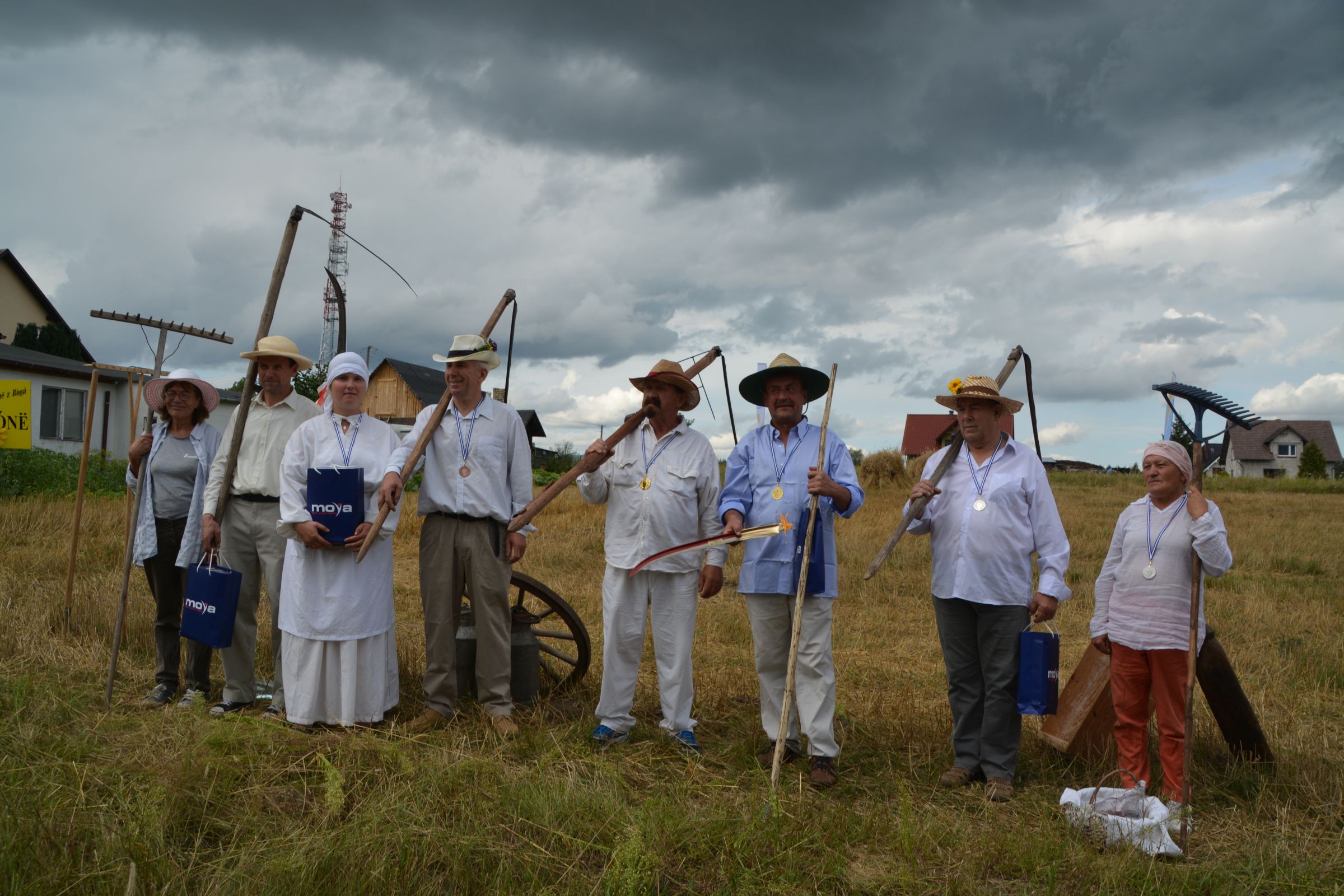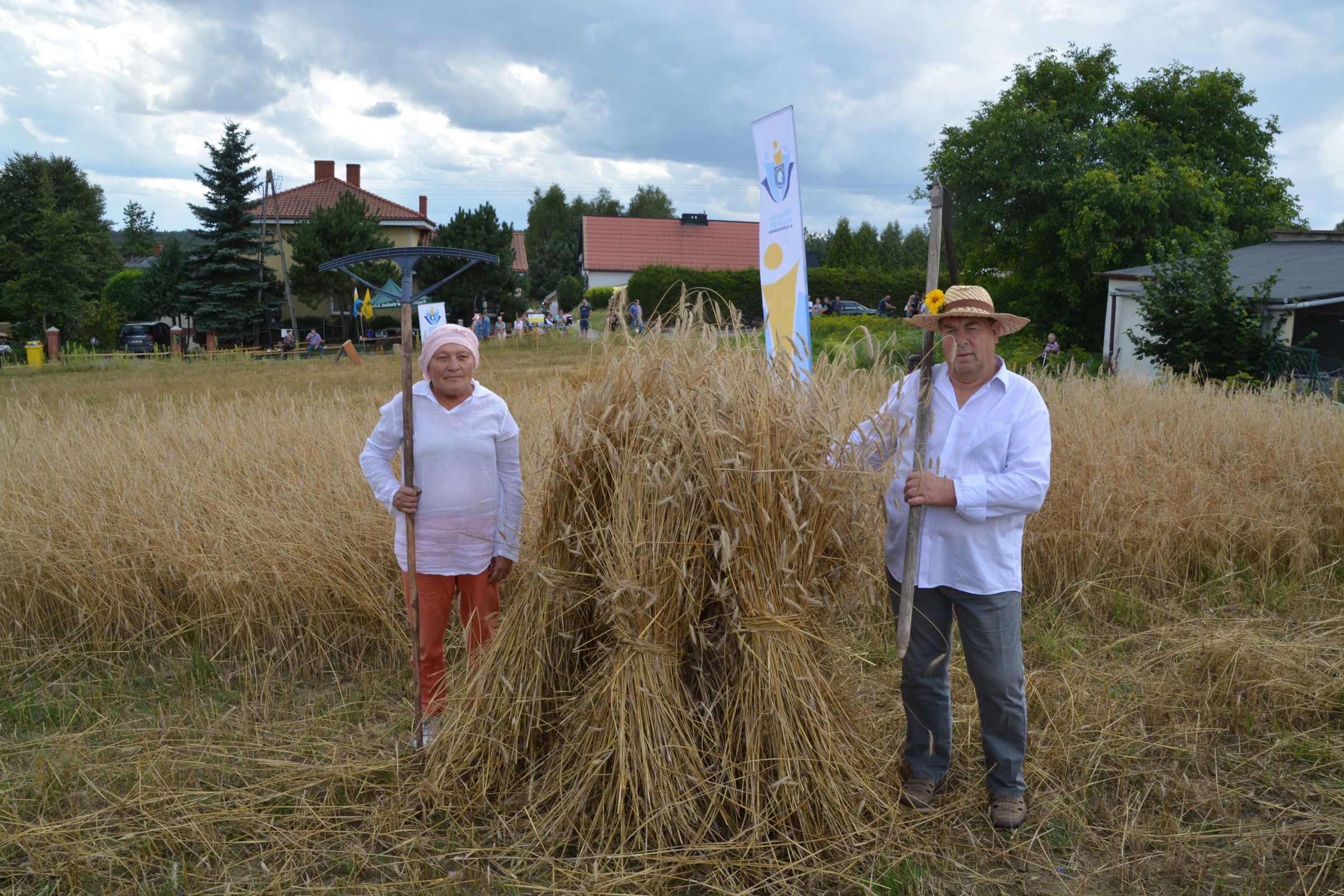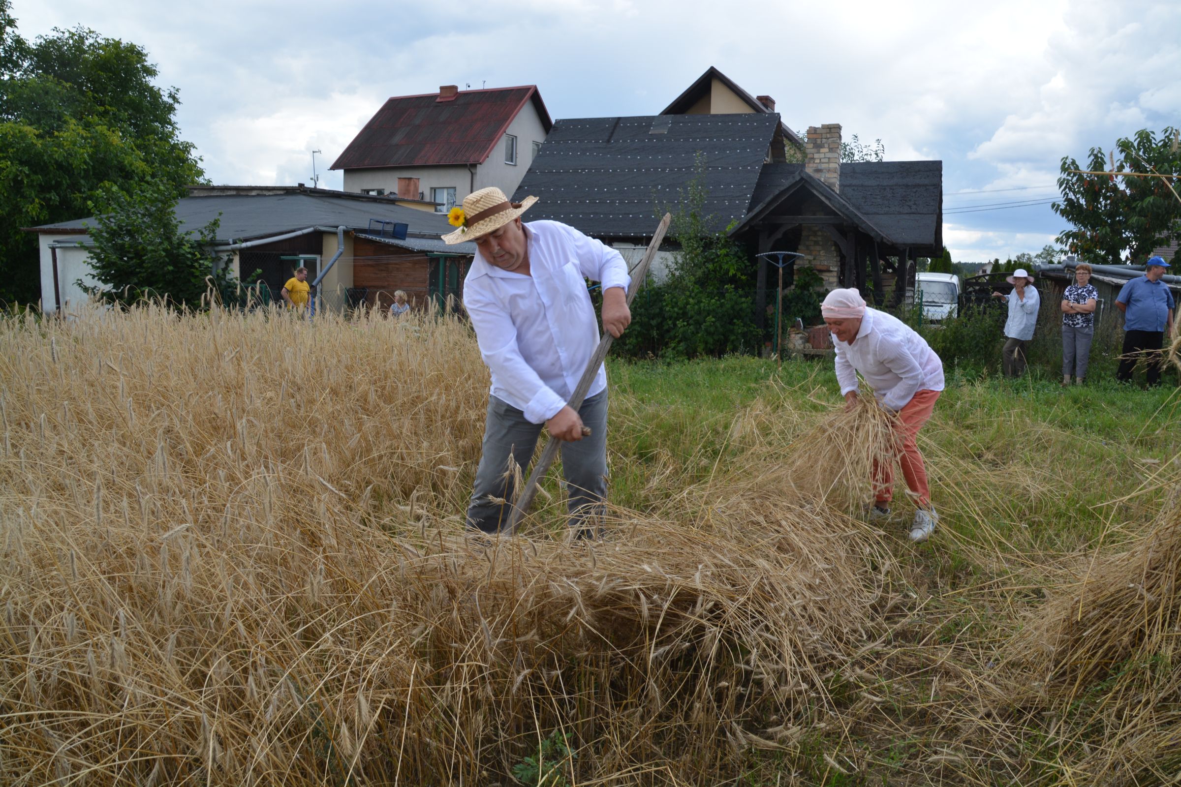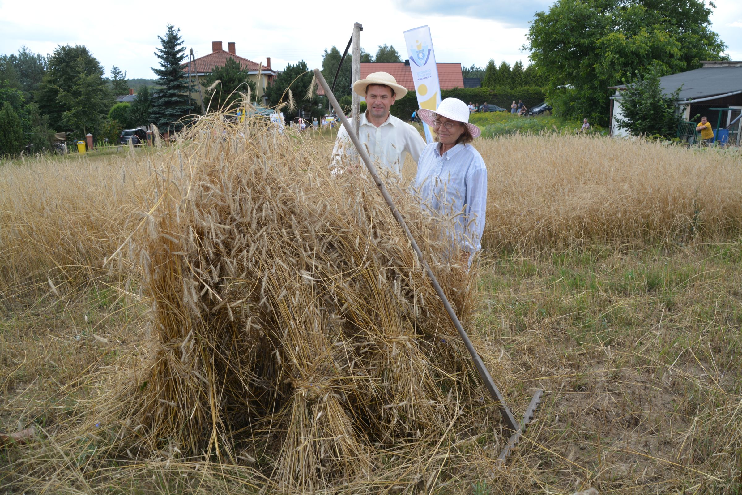 Ocalenie tradycji – to główny cel Mistrzostw Polski w Koszeniu Zboża Metodą Tradycyjną. W niedzielę 04. sierpnia br., te widowiskowe zawody odbyły się w naszej gminie już po raz piąty. Na początku imprezy Pan Dyrektor Ośrodka Kultury Dariusz Turzyński oraz Pan Wójt Leszek Pobłocki zapoznali uczestników z zasadami zawodów oraz krótko przedstawili kaszubską tradycję tych zmagań. Następnie 4 pary żniwiarzy stanęły w szranki. Ich zadaniem było wykoszenie wydzielonego pasa zboża, a następnie powiązanie go w snopki i ustawienie w sztygę. Najszybciej z tym zadaniem uporała się para: Stanisław Kuczkowski oraz Józef Czapiewski i to do nich powędrowała “Złota Kosa Ośrodka Kultury” oraz nagrody rzeczowe ufundowane przez stację paliw „Moya” pana Stanisława Repińskiego. Następni byli: