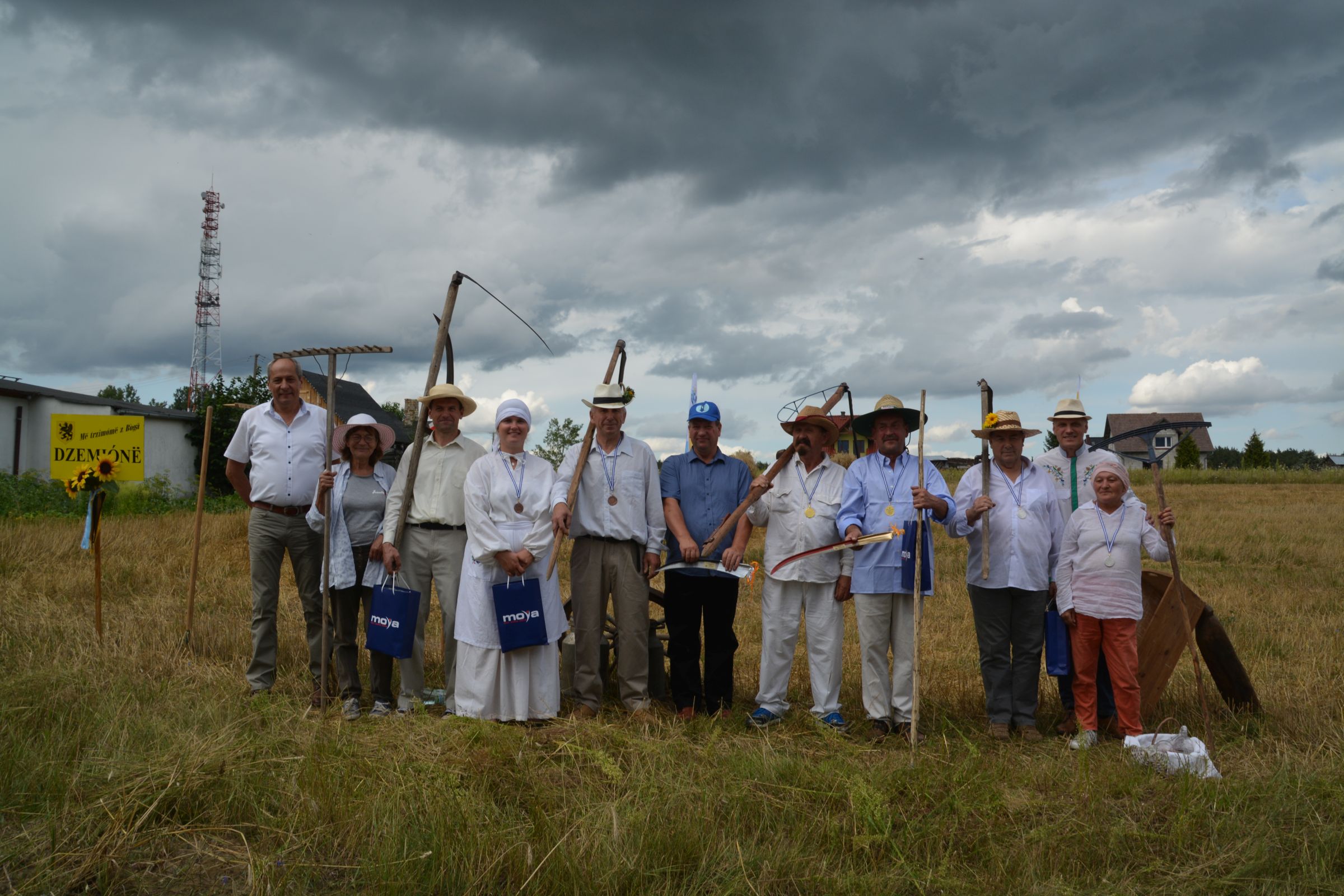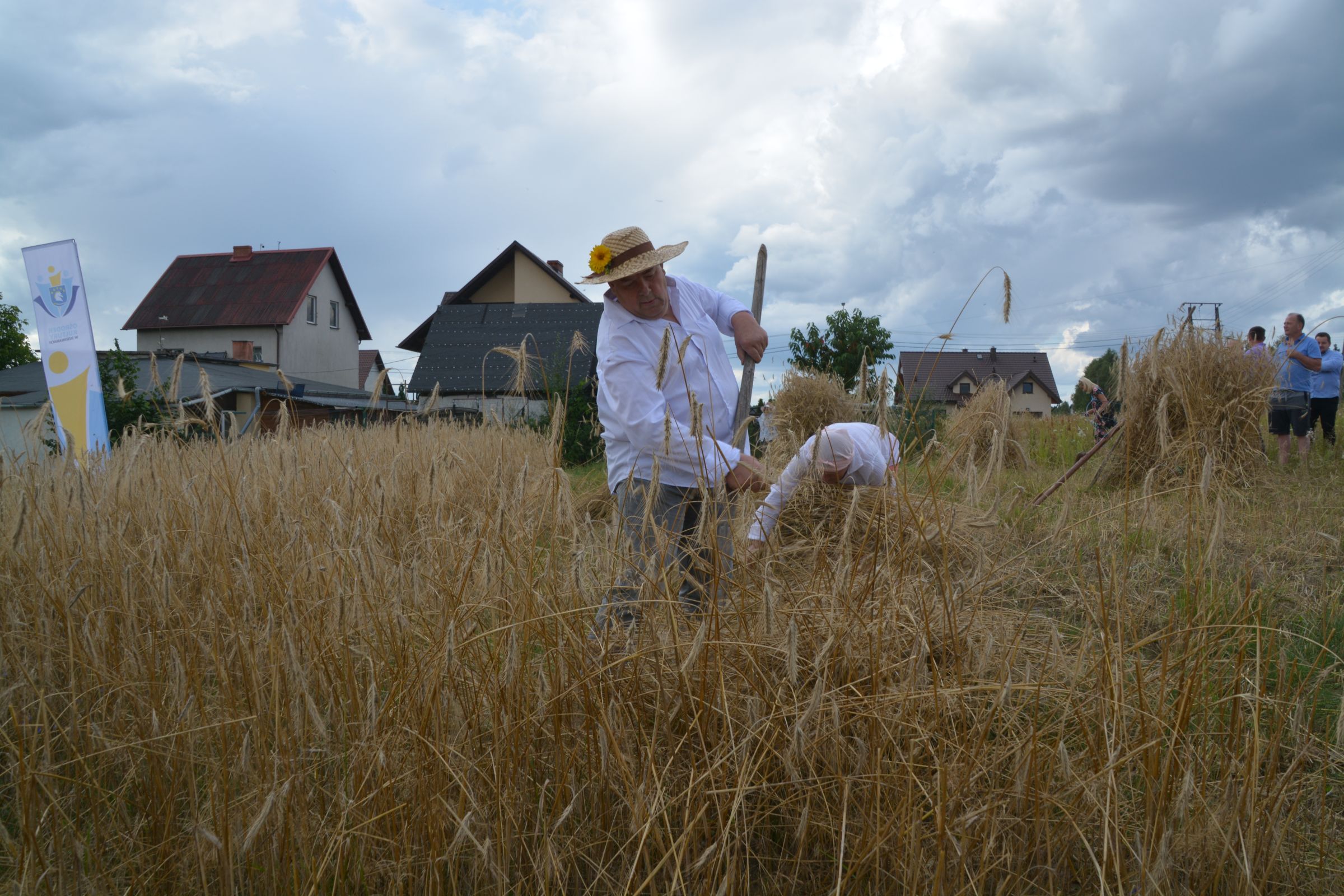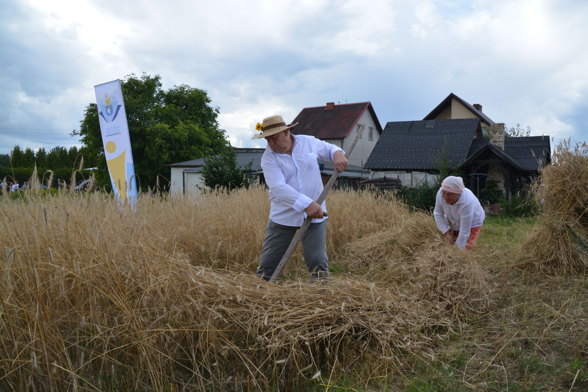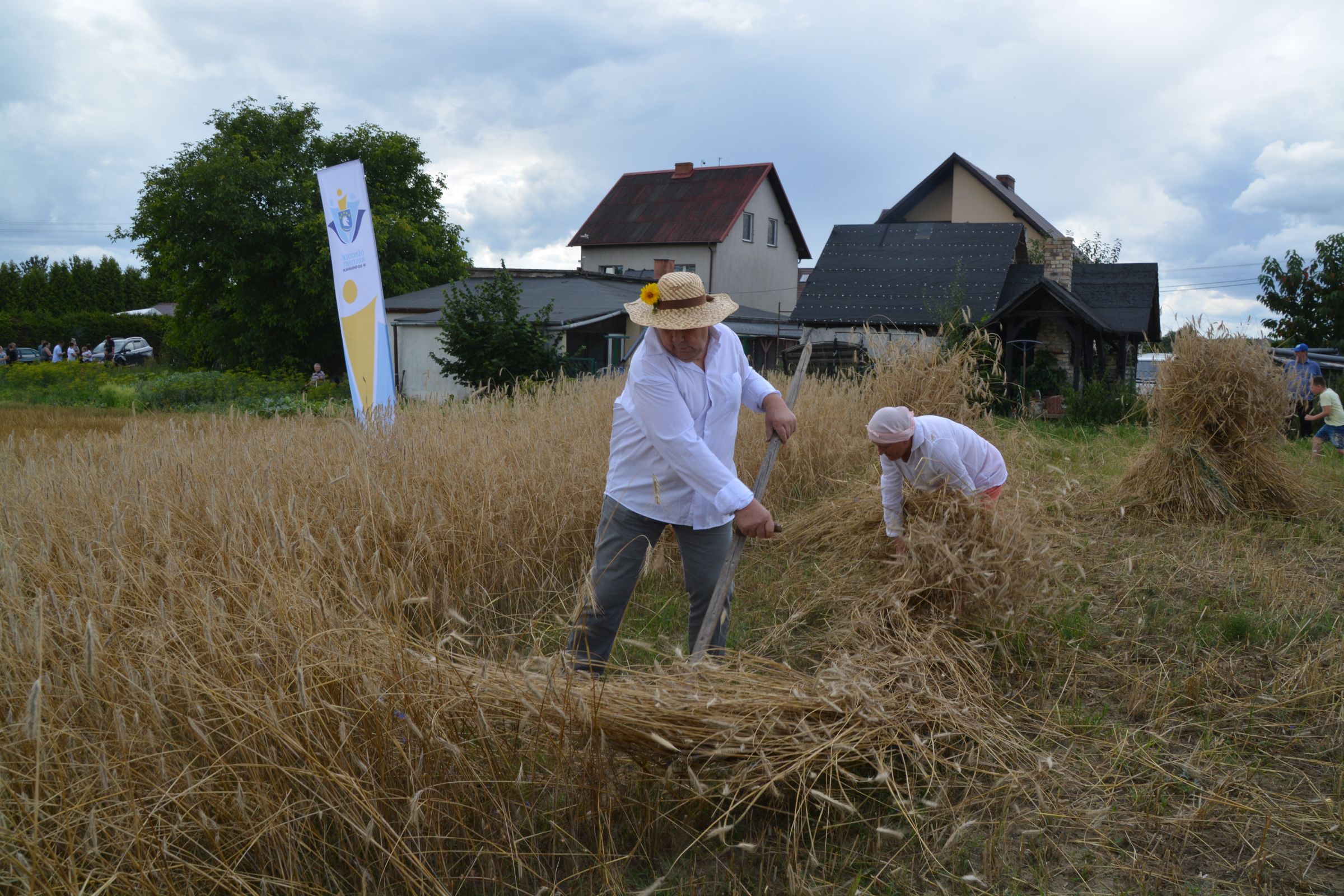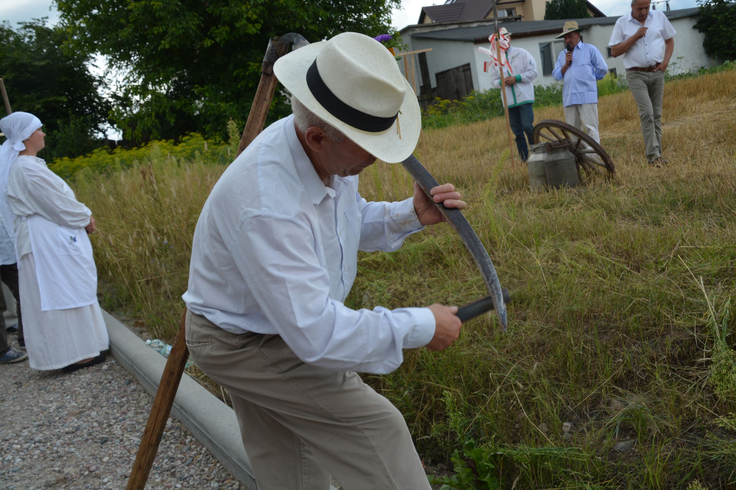Ocalenie tradycji – to główny cel Mistrzostw Polski w Koszeniu Zboża Metodą Tradycyjną. W niedzielę 04. sierpnia br., te widowiskowe zawody odbyły się w naszej gminie już po raz piąty. Na początku imprezy Pan Dyrektor Ośrodka Kultury Dariusz Turzyński oraz Pan Wójt Leszek Pobłocki zapoznali uczestników z zasadami zawodów oraz krótko przedstawili kaszubską tradycję tych zmagań. Następnie 4 pary żniwiarzy stanęły w szranki. Ich zadaniem było wykoszenie wydzielonego pasa zboża, a następnie powiązanie go w snopki i ustawienie w sztygę. Najszybciej z tym zadaniem uporała się para: Stanisław Kuczkowski oraz Józef Czapiewski i to do nich powędrowała “Złota Kosa Ośrodka Kultury” oraz nagrody rzeczowe ufundowane przez stację paliw „Moya” pana Stanisława Repińskiego. Następni byli: