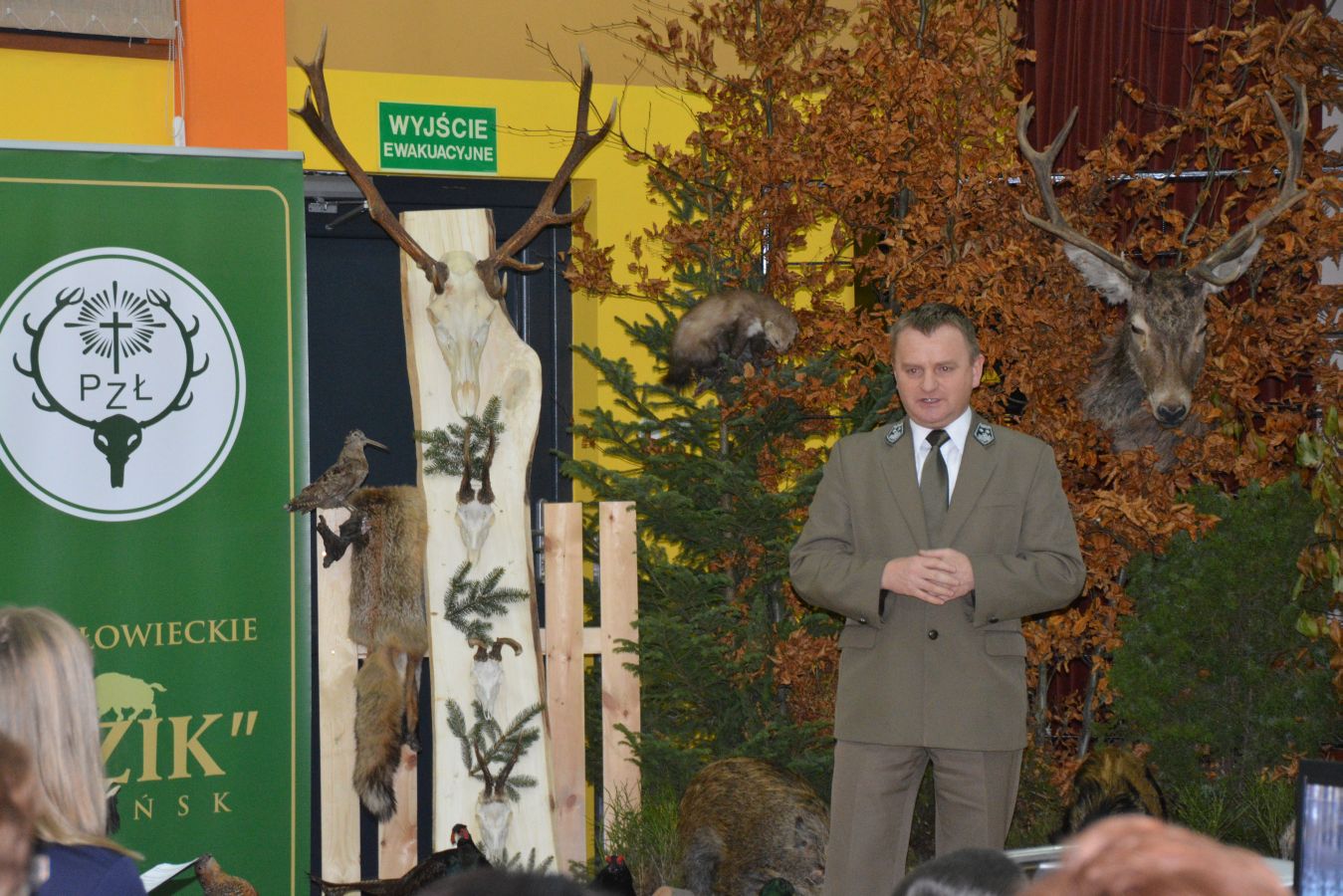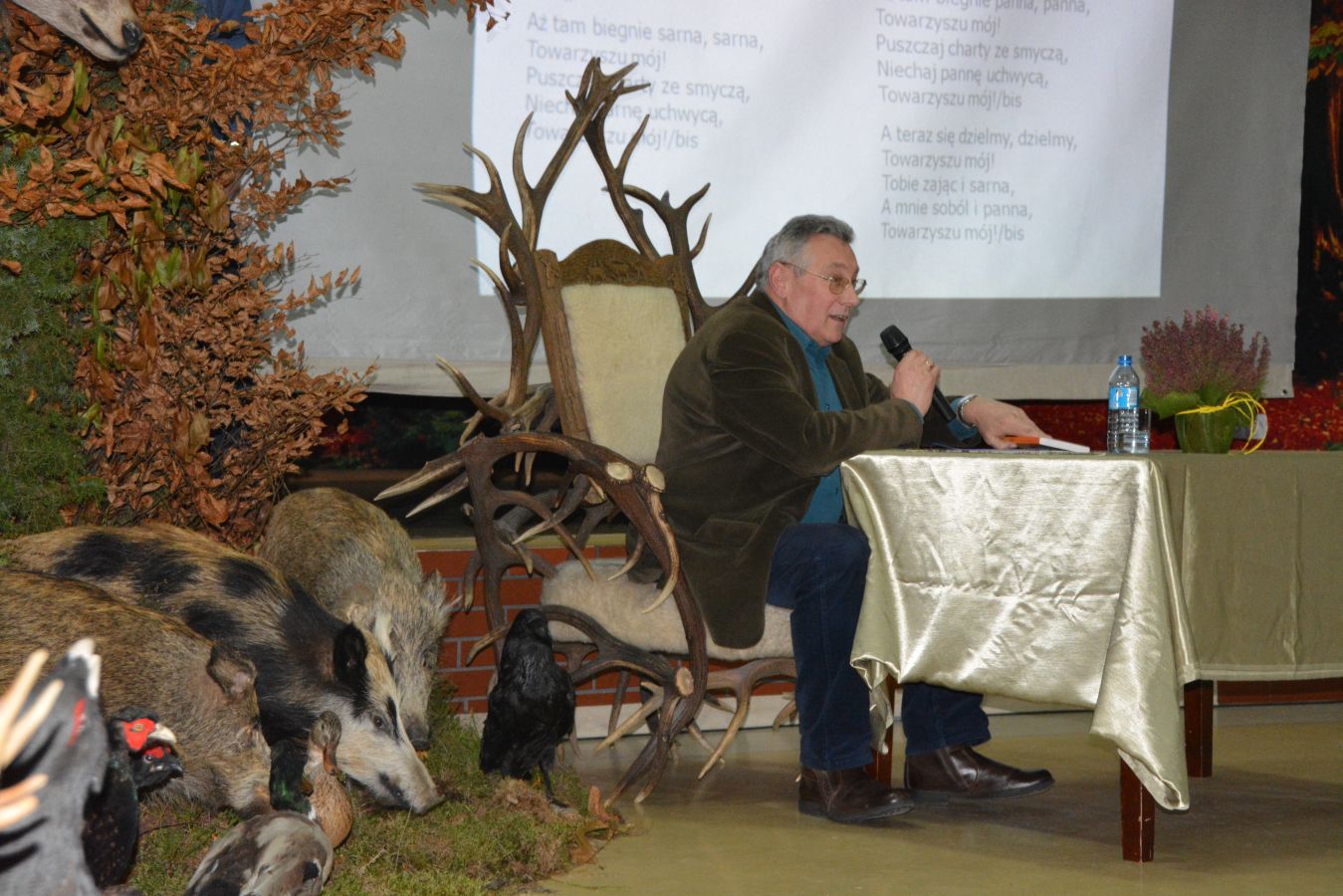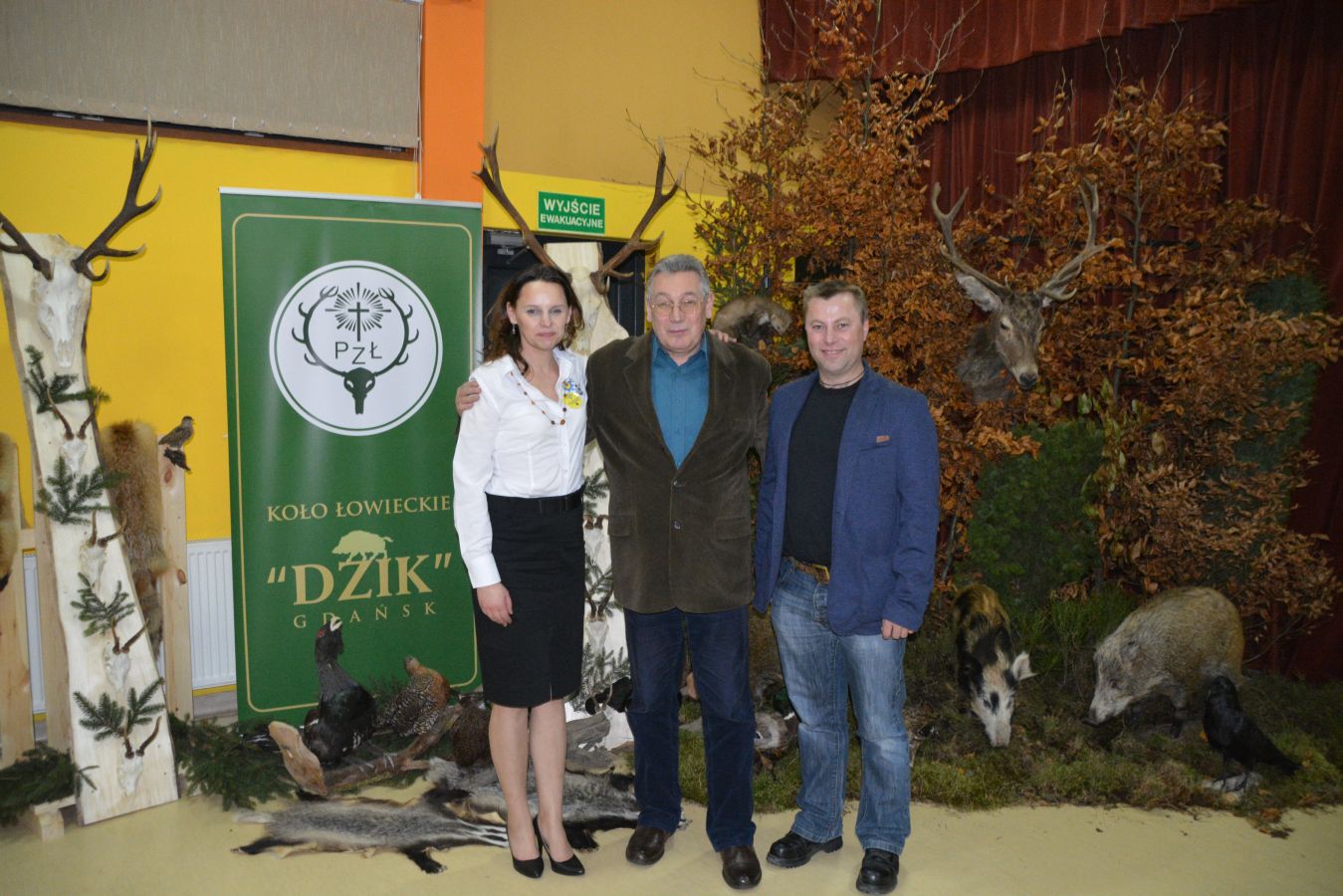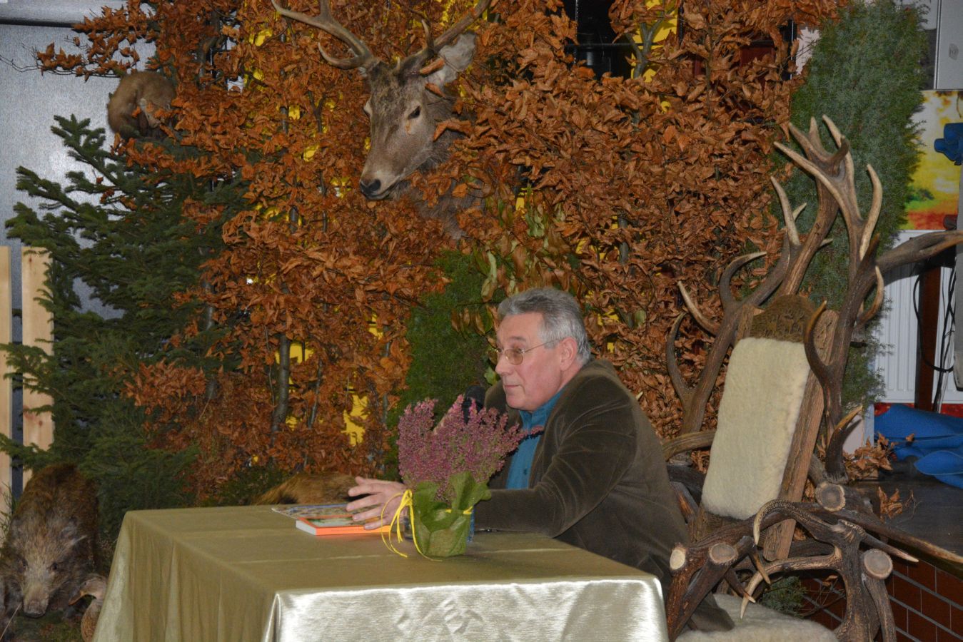 Myśliwi z Koła Łowieckiego „Dzik” przygotowali bogatą wystawę trofeów łowieckich, która zdobiła salę i stała się tłem spotkania. Zaprezentowali nawet wielkiego głuszca, znanego już tylko nielicznym mieszkańcom Pomorza, który jest jednym z „bohaterów” powieści. Udostępnił go ze swojej kolekcji wielki dziemiański pasjonat polowań p. Roman Kołodziejczyk. Dzięki uprzejmości p. Mariusza Kartuszyńskiego z Koła Łowieckiego „Ponowa” prelegent podczas wystąpienia oraz dedykowania kolejnych egzemplarzy książki, które dołączą do kilkudziesięciu kaszubskich biblioteczek domowych w Dziemianach i okolicy, mógł zasiąść na majestatycznym siedzisku z jelenich rogów.