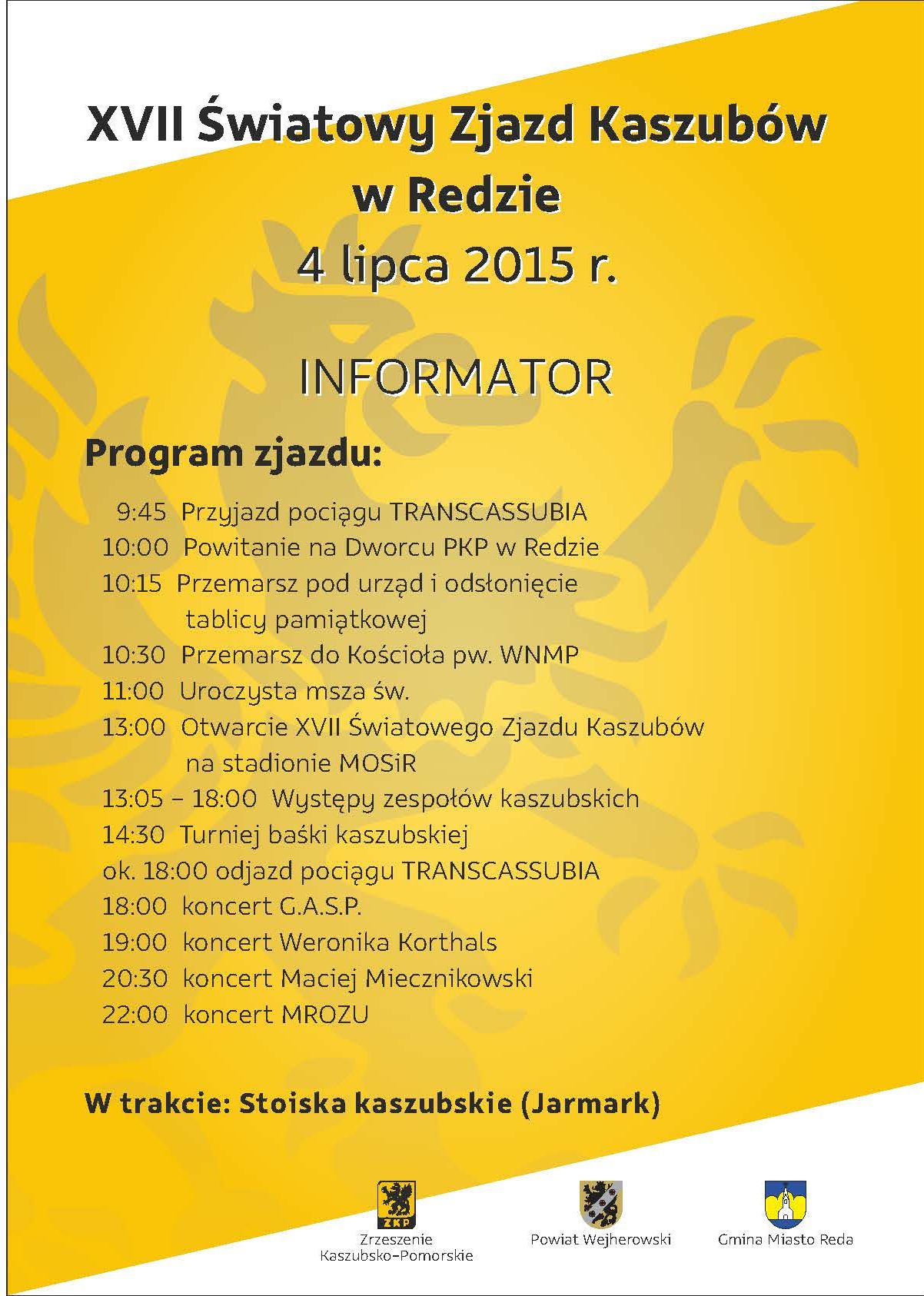 Zrzeszenie Kaszubsko-Pomorskie oddział w Dziemianach organizuje wyjazd z Dziemian na XVII Zjazd Kaszubów w Redzie. Ponieważ trasa Transcassubii nie prowadzi w tym roku przez Dziemiany Kaszubskie planujemy wspólny wyjazd autokarem. Składka po 10zł płatna jest już podczas rezerwacji w biurze Ośrodka Kultury. Wyjazd w sobotę, 4 lipca o godz. 7.30 powrót ok. godz. 22.30. Liczba miejsc jest ograniczona i musimy ją znać do najbliższej soboty. Prosimy więc o zgłoszenia: osobiście w Ośrodku Kultury lub telefonicznie na nr 692-988-961 oraz gorąco polecamy udział w tym fantastycznym regionalnym wydarzeniu.