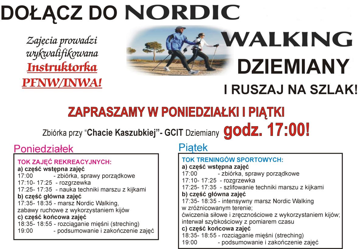 Już od 1 września ponownie grupa Nordic Walking Dziemiany rozpoczyna systematyczne treningi. Zajęcia odbywać się będą w każdy poniedziałek i piątek o godzinie 17:00. Zbiórka tradycyjnie przed chatą kaszubską „GCIT” w Dziemianach. Zapraszamy wszystkich chętnych, aby przyłączyli się do naszej drużyny i zasilili szeregi Nordic Walking Dziemiany. Zajęcia będą miały charakter dwupoziomowy. W poniedziałki zapraszamy przede wszystkim początkujących na rekreacyjny marsz malowniczymi szlakami naszej gminy. W piątki treningi przybiorą bardziej intensywny charakter, który będzie skierowany głównie do osób aktywnych fizycznie .